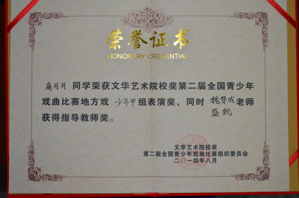2014年8月,由卫赞成、盛凯指导,学生商月月表演的秦腔《悔路》获文华艺术院校奖第二届全国青少年戏曲比赛地方戏少年甲组表演奖。