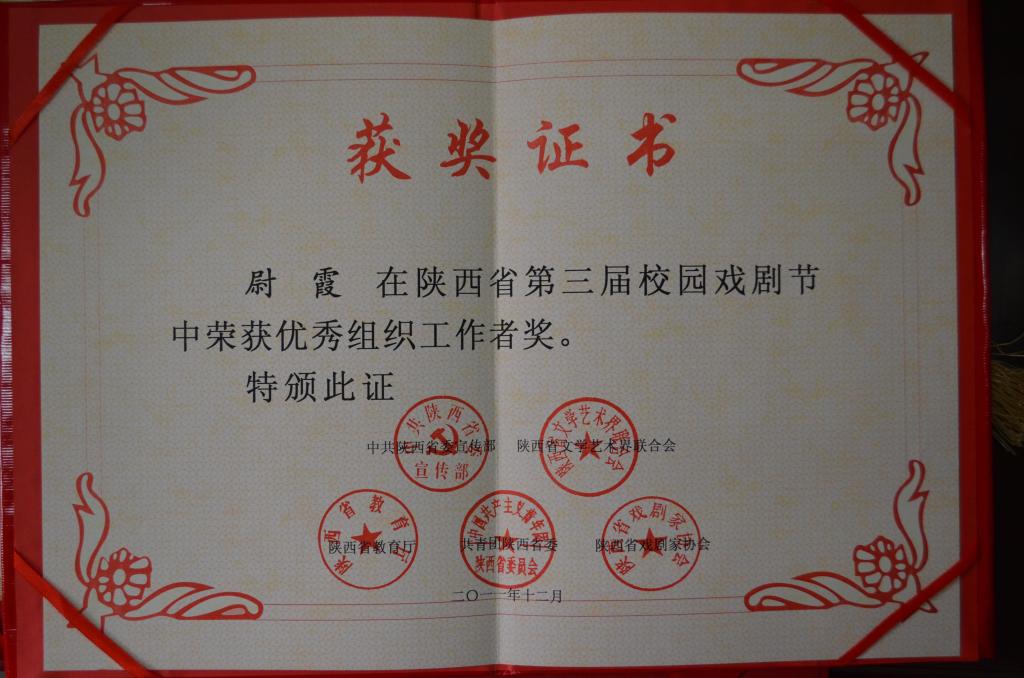 2011年12月,尉霞在陕西省第三届校园戏剧节中荣获优秀组织工作者奖。