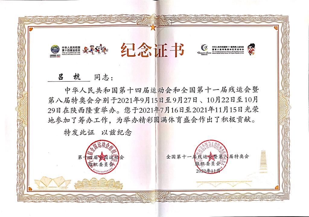 中华人民共和国第十四届运动会和全国第十一届残运会暨第八届特奥会纪念证书