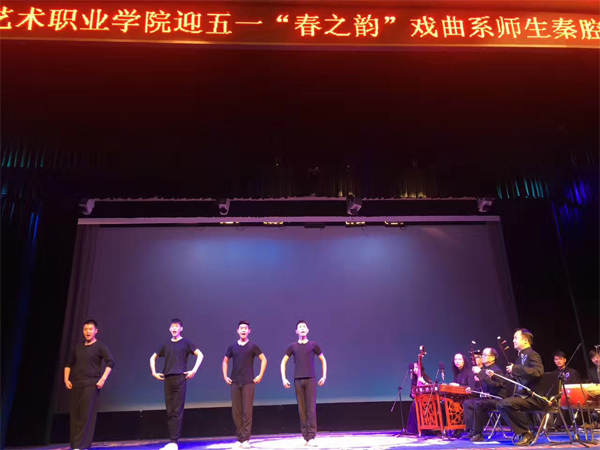 教师方面老、中、青三代竞相展演,在职、外聘教师联袂奉献,以青年教师为代表的杨阳、吴静演唱了《血泪仇》、《黄鹤楼》选段,中年教师尉霞、梁安建、李卫平、赵朝霞献唱了《藏舟》、《打镇台》、《拾黄金》、《夺锦楼》选段,老教师以赵瑞斌、刘晓玲为主打,演唱了《打銮驾》、《庚娘仇杀》选段。学生方面大班、小班同台展示,中职、高职逐一汇演,整场演出效果极佳。